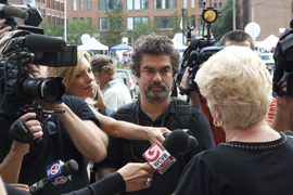 Academy Award nominated director Joe Berlinger (center) interviews Patricia Donahue (right), wife of Bugler victim Michael Donahue, on the set of WHITEY: United States v. James J. Bulger, a Magnolia Pictures release. Photo courtesy of Magnolia Pictures. Photo credit: Daniel Wilson