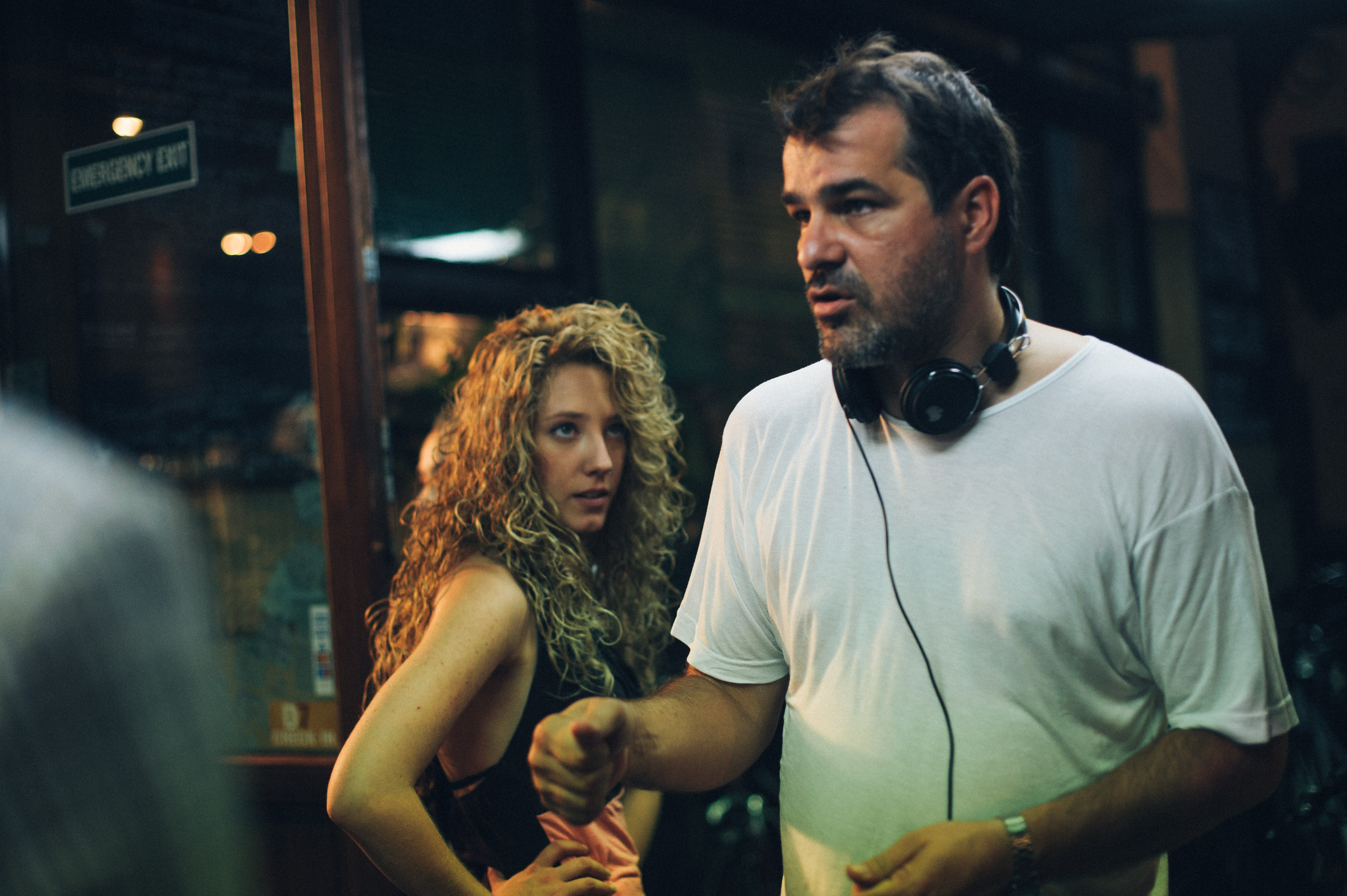 Animal trainer Teresa Miller with director Kornél Mundruczó on the set of WHITE GOD, a Magnolia Pictures release. Photo courtesy of Magnolia Pictures. | |  Director Kornél Mundruczó on the set of WHITE GOD, a Magnolia Pictures release. Photo courtesy of Magnolia Pictures. |