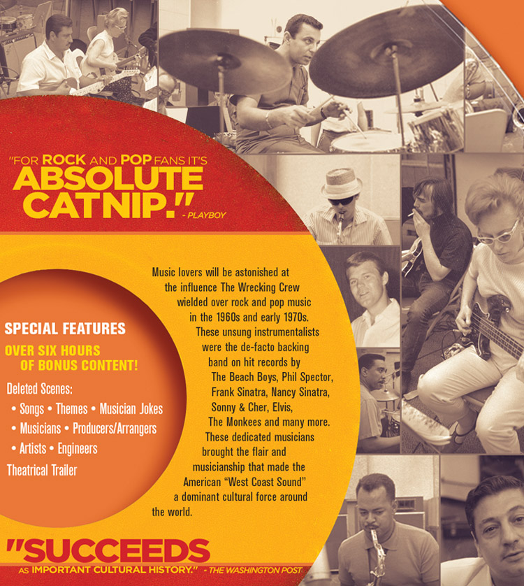 Music lovers will be astonished at the influence The Wrecking Crew wielded over rock and pop music in the 1960s and early 1970s. These unsung instrumentalists were the de-facto backing band on hit records by The Beach Boys, Phil Spector, Frank Sinatra, Nancy Sinatra, Sonny & Cher, Elvis, The Monkees and many more. These dedicated musicians brought the flair and musicianship that made the American “West Coast Sound” a dominant cultural force around the world.