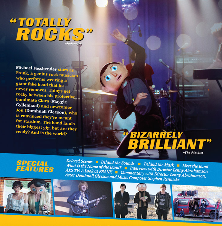 "Darkly funny, whip-smart, impressively original and boasting one of Michael Fassbender's most towering performances to date, Frank just about has it all. YOU WON’T WANT TO MISS FRANK. Never less than mesmerizing even when it’s swimming in deep waters, and never lets its big questions get in the way of subversively black comedy, compelling drama and great music. It all leads to one of the most profoundly touching and tear-jerkingly beautiful endings I’ve seen on screen in a long time."