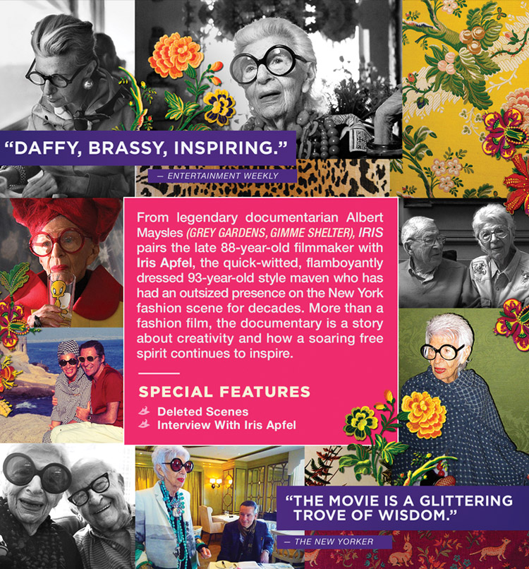 From legendary documentarian Albert Maysles (GREY GARDENS, GIMME SHELTER), IRIS pairs the late 88-year-old filmmaker with Iris Apfel, the quick-witted, flamboyantly dressed 93-year-old style maven who has had an outsized presence on the New York fashion scene for decades. More than a fashion film, the documentary is a story about creativity and how a soaring free spirit continues to inspire.