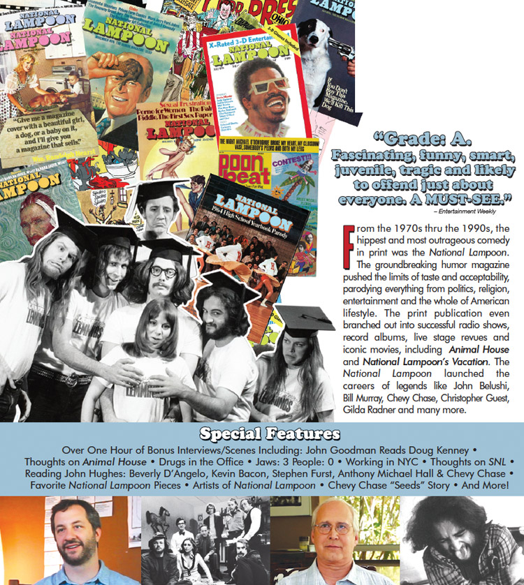 From the 1970s thru the 1990s, the hippest and most outrageous comedy in print was the National Lampoon. The groundbreaking humor magazine pushed the limits of taste and acceptability parodying everything from politics, religion, entertainment and the whole of American lifestyle. The print publication even branched out into successful radio shows, record albums, live stage revues and iconic movies, including Animal House and National Lampoon’s Vacation. The National Lampoon launched the careers of legends like John Belushi, Bill Murray, Chevy Chase, Christopher Guest, Gilda Radner and many more.